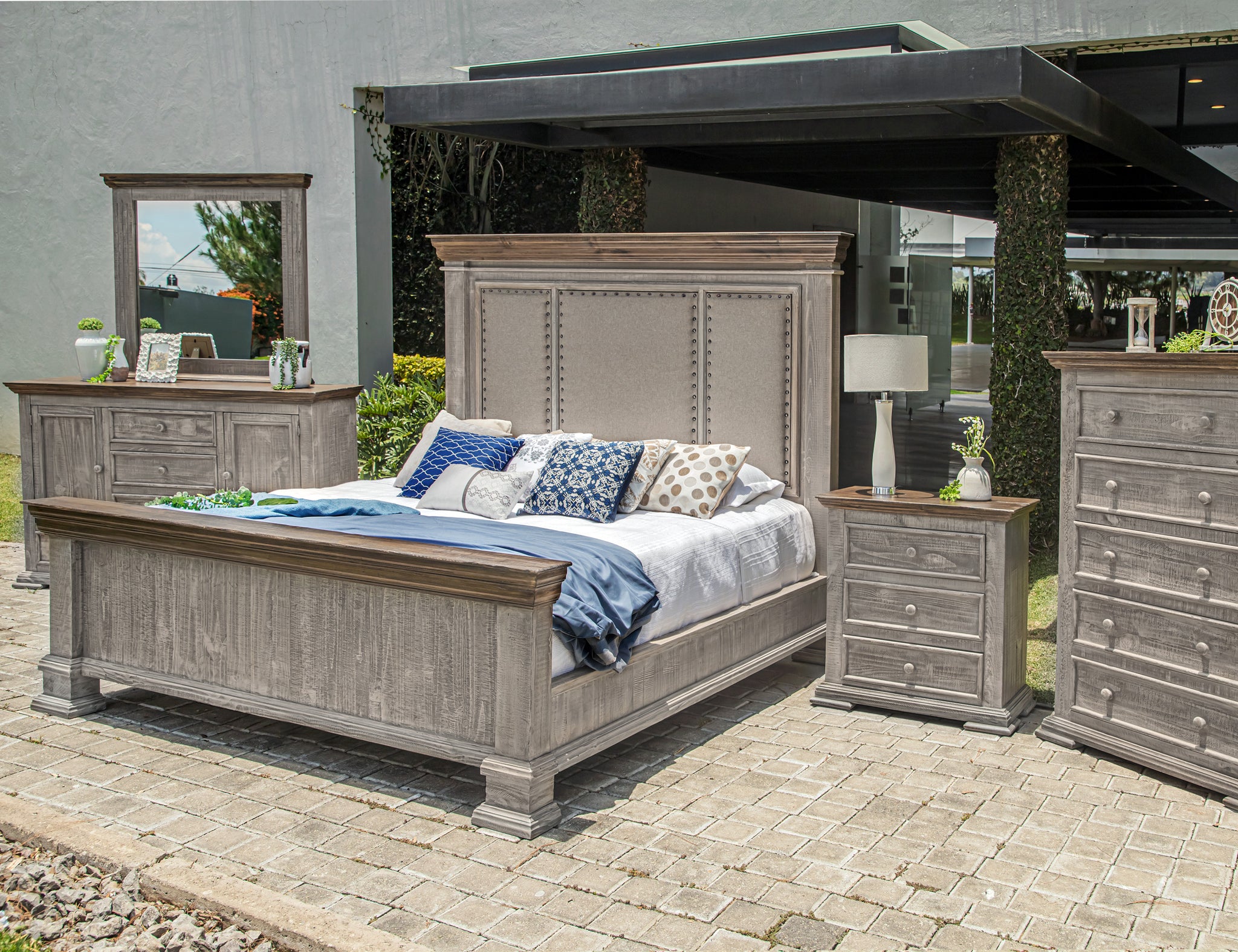 Finish is achieved through a multi-step lacquer process featuring weathered gray and natural brown tops.