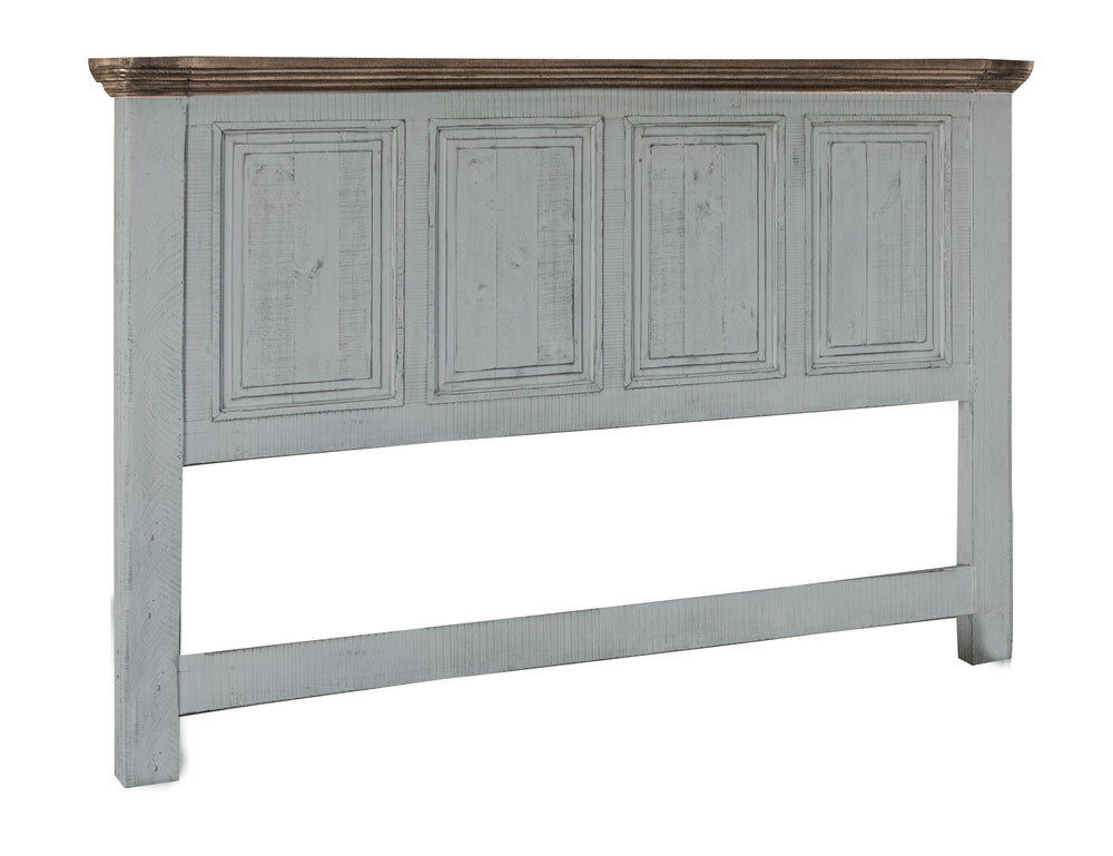 Finish is achieved through a multi-step lacquer in a weathered gray, with natural brown tops.