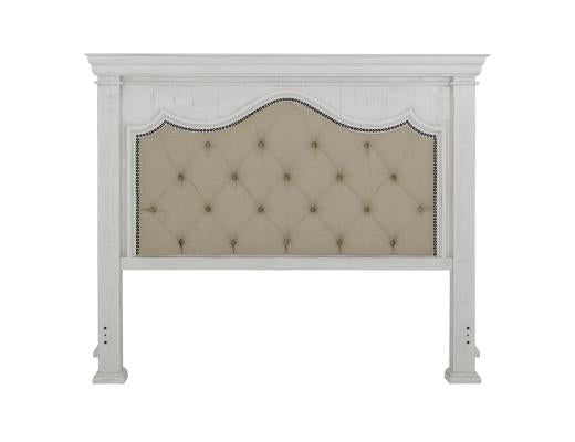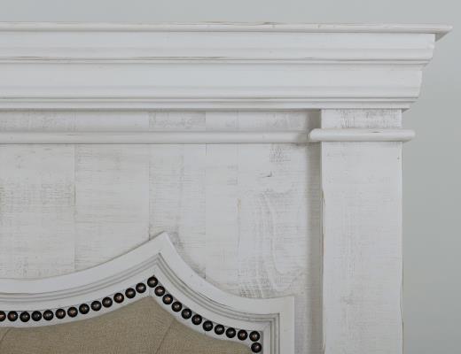 Fabricado en madera de pino maciza. El acabado se consigue mediante un proceso de lacado en varios pasos en un tono blanco vintage. La construcción de mortaja y espiga ofrece estabilidad y durabilidad. Cabecero tapizado con adornos de tachuelas.