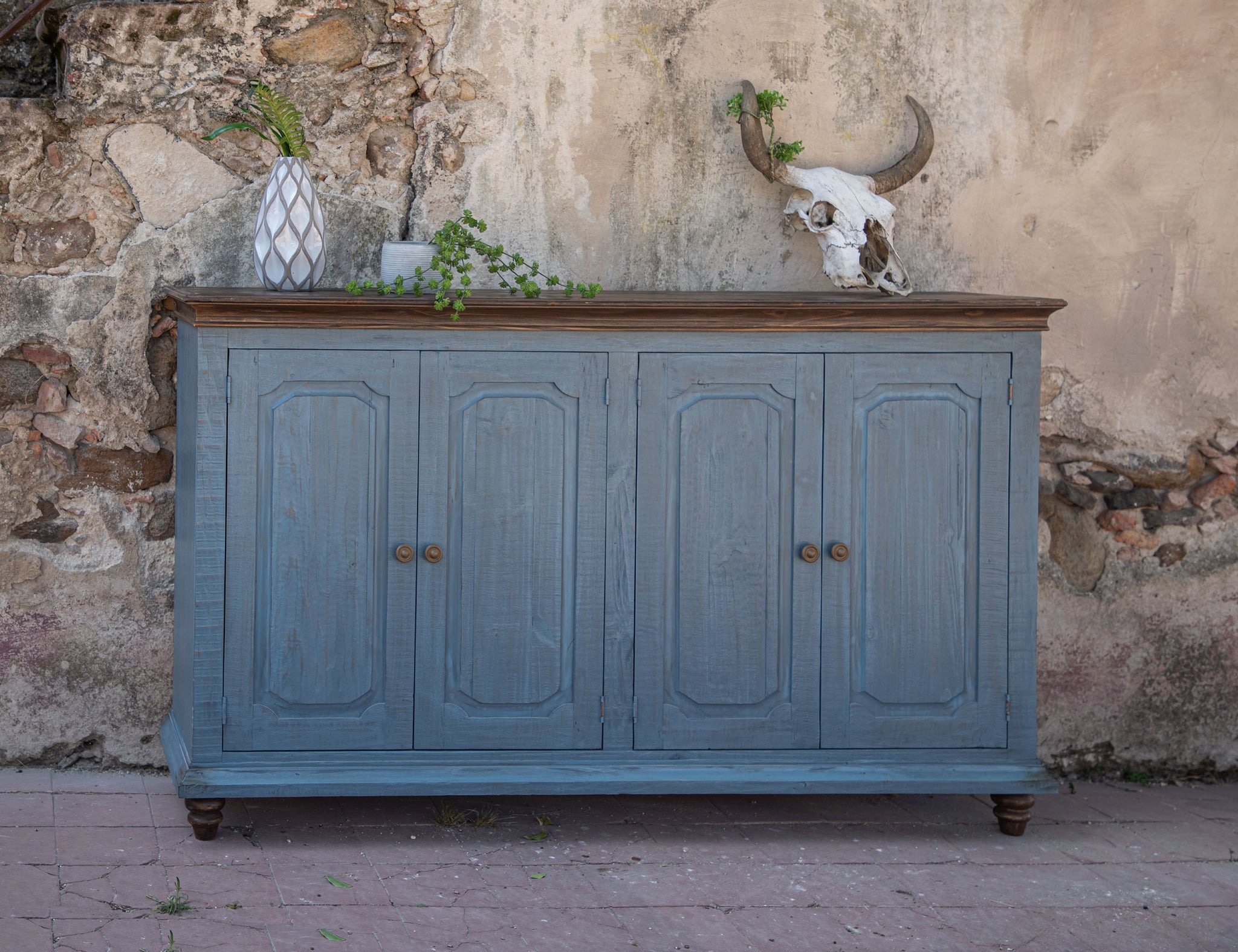 Multi-step lacquer finish in sky blue and brown tops